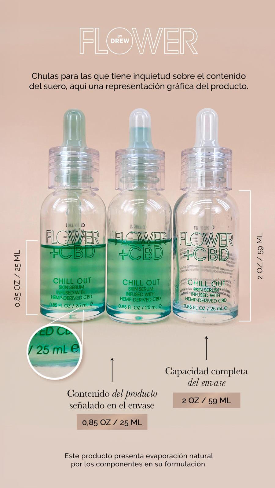 Flower Beauty ha confirmado que el contenido del Chill Out Hydrating Skin Serum es de 25ML, con una variación permitida del 5% al 10% debido a evaporación natural. Aunque la botella tiene capacidad para más del doble de la cantidad indicada, el volumen líquido entregado está dentro del rango permitido.Pruebas y certificación: